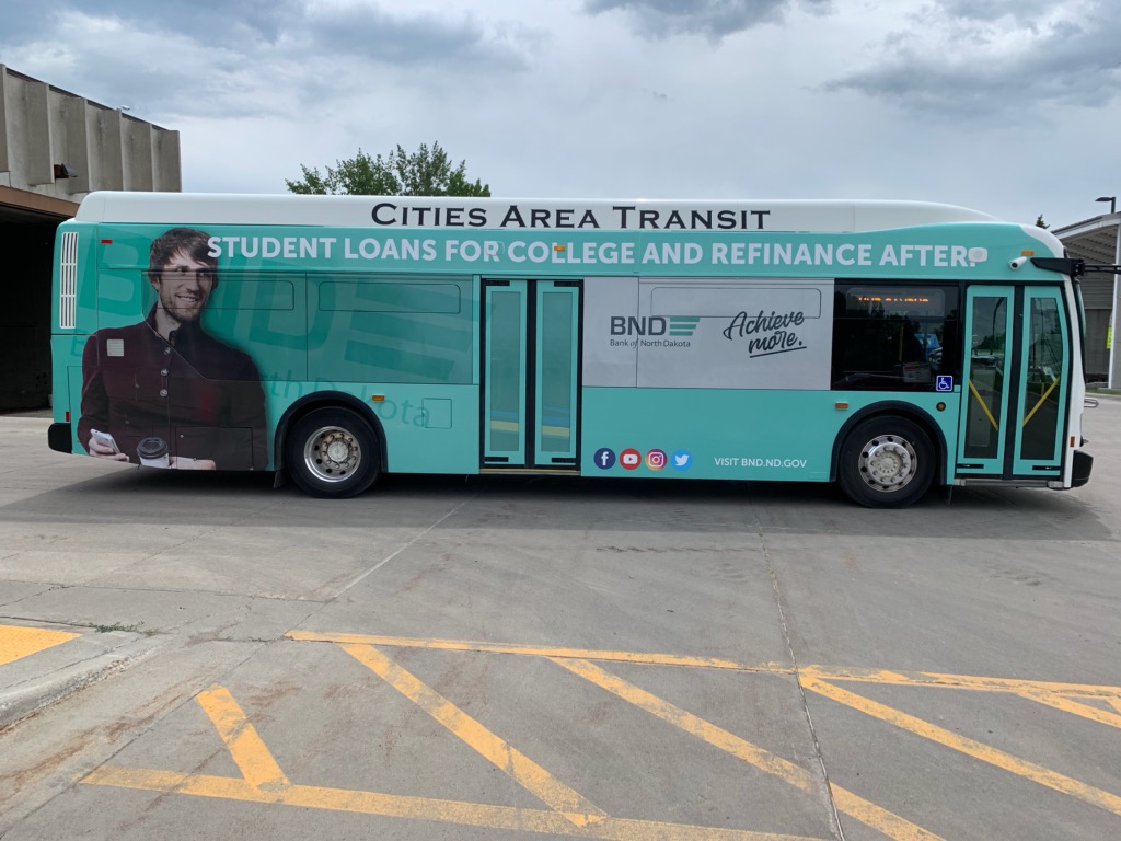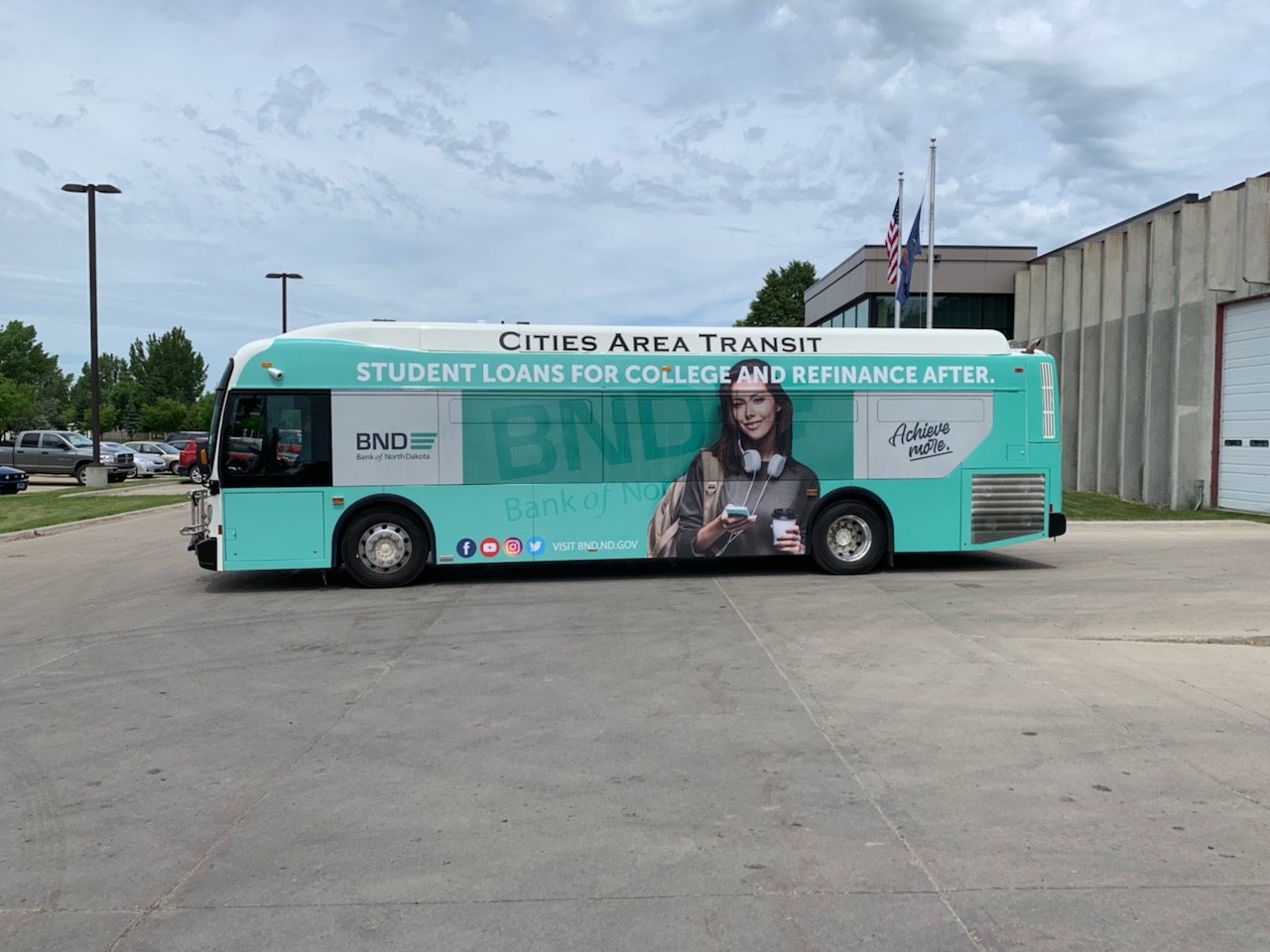 This full wrap on a city bus in Grand Forks was a big project, but it turned out looking great! Note the perforated material on the windows.