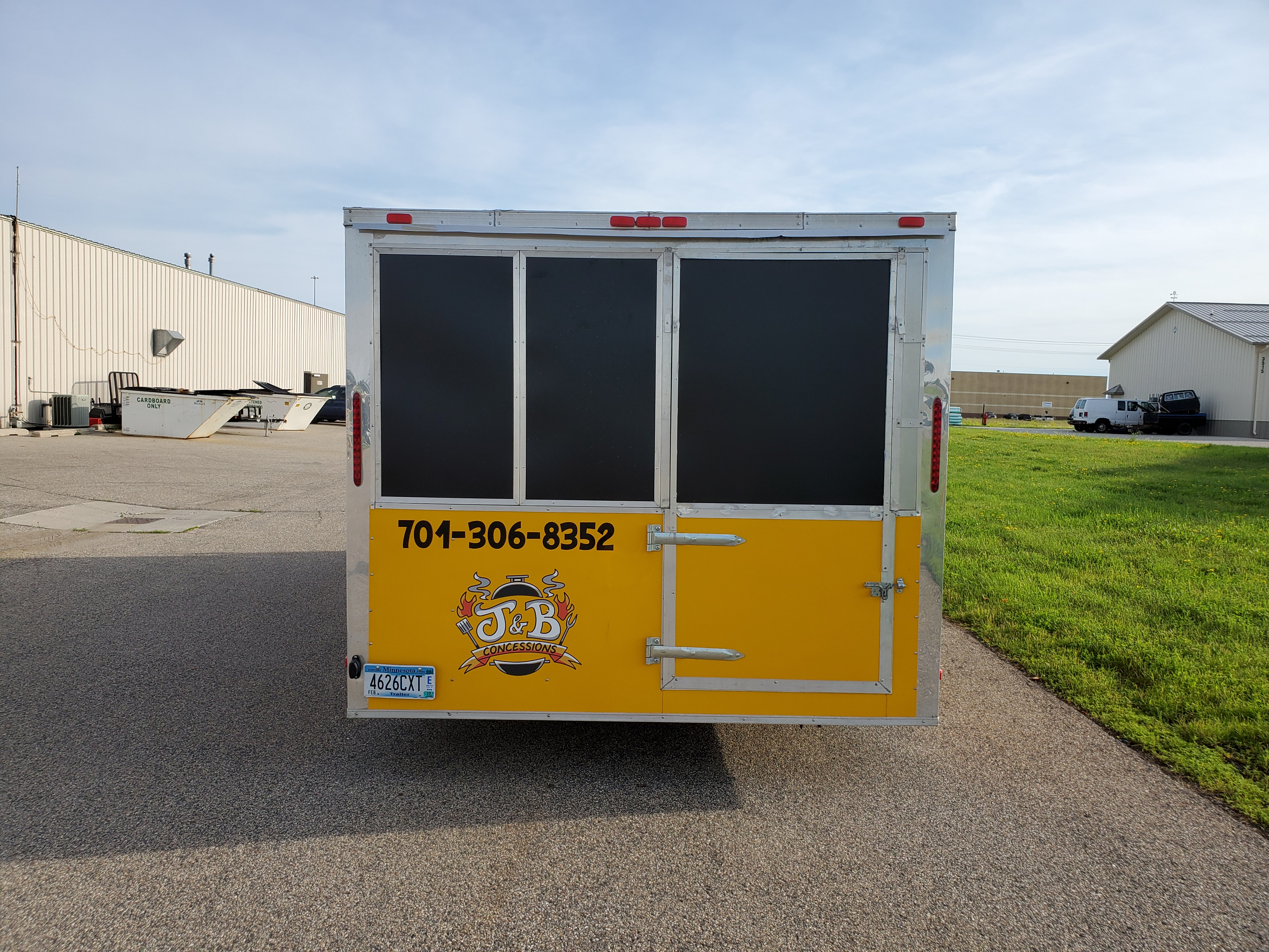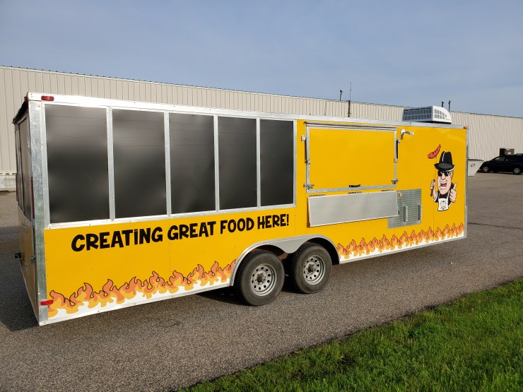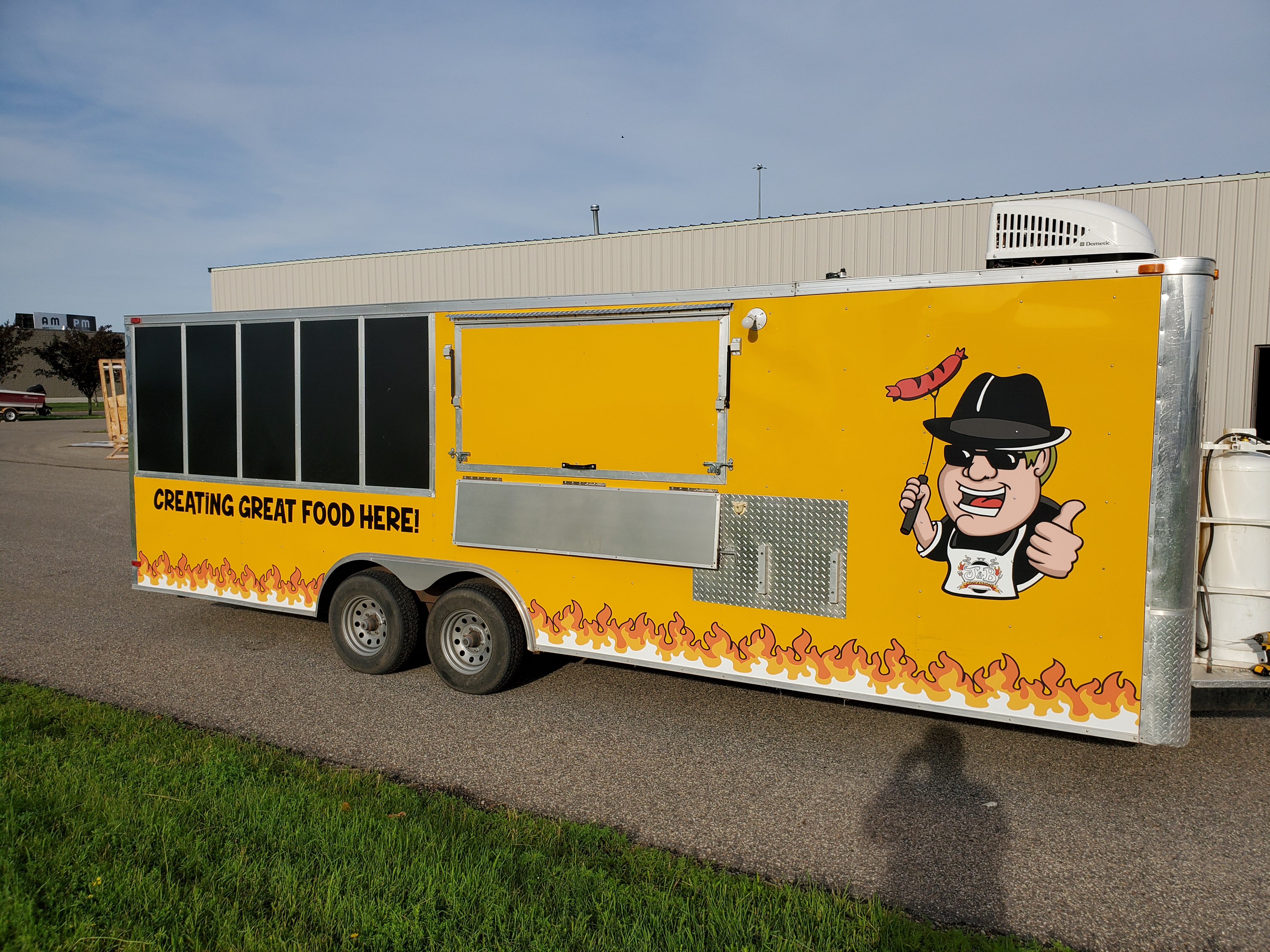 This is a concession trailer with printed vinyl decals. The flames and caricatures are both plot-cut for a precise and clean look. It looks really cool!