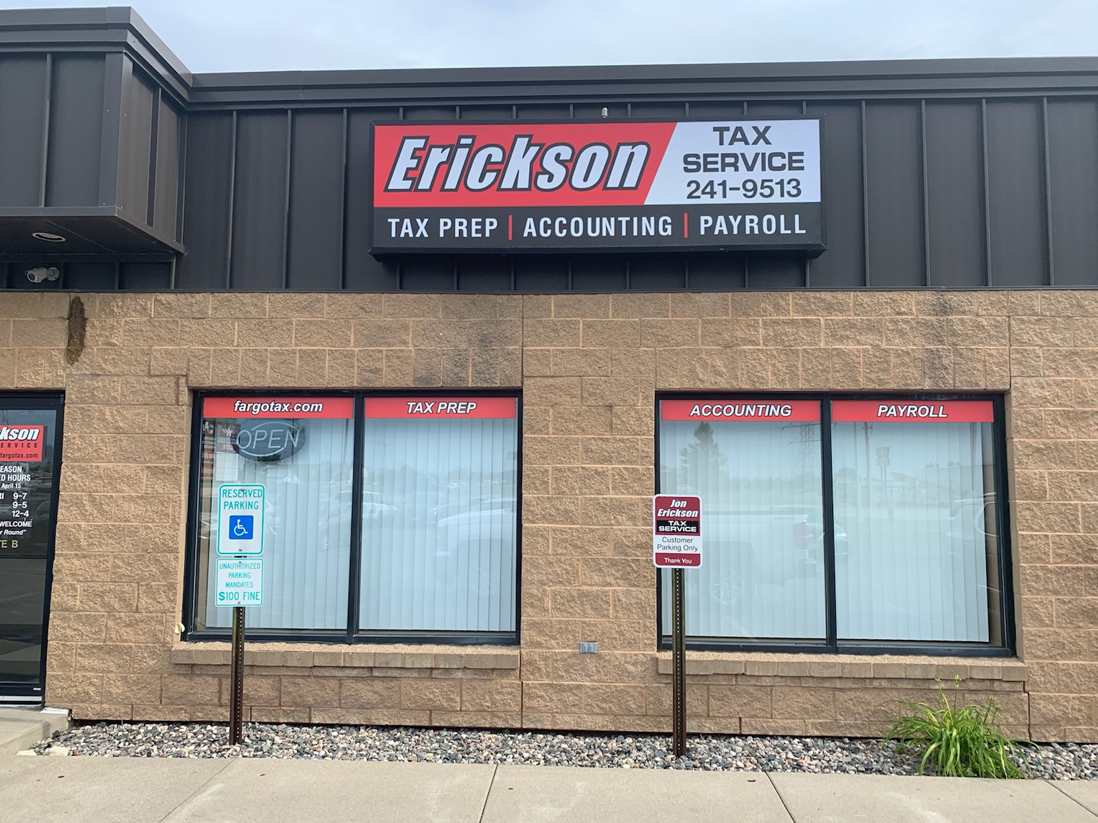 This 3’H x 10’W sign just went up this morning at Erickson Tax in Fargo. The sign is backlit, so the red vinyl is translucent to let the light shine through. The red vinyl strips atop the windows were also installed by us this morning. Contact us if your business needs a visual update!